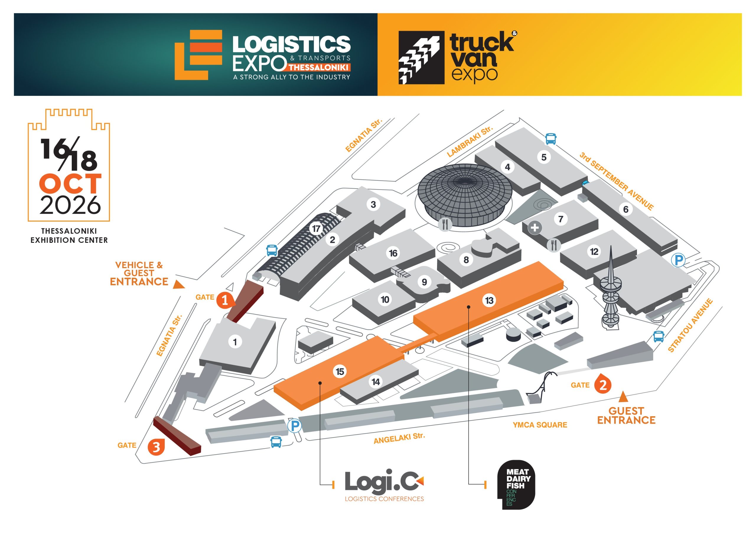 LOGISTICS EXPO 2026 will take place at the Thessaloniki International Exhibition Centre. Specifically, the exhibitors’ stands will be hosted in Halls 13 and 15. Running concurrently, the TRUCK & VAN EXPO 2026 will also be held at the same venue.